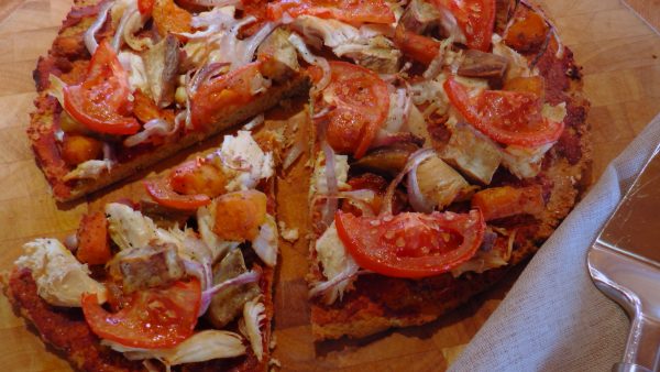 My pizza had tomato paste, leftover roast chicken, leftover roast kumara and pumpkin, red onion and tomatoes.
