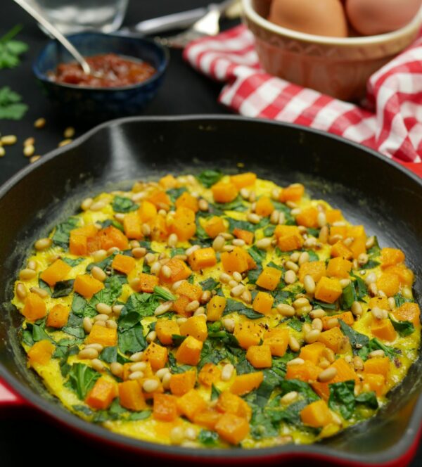 The simple omelette is a versatile, quick, and healthy meal you can whip up in no time. It makes for a great breakfast, late night supper, lunch, post-workout meal, or even a light dinner with a salad and fermented vegetables on the side. This is my favourite combination; the subtle sweetness of pumpkin goes well with meltingly soft spinach and the warm, woody taste of nutmeg. Top with pine nuts for a delightful crunch.
