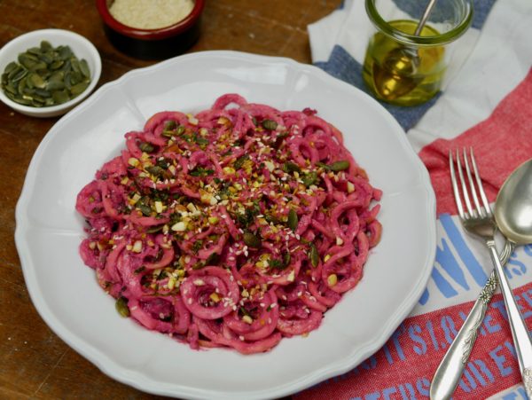 When the chicken is almost done, prepare the noodles. Using a spiraliser, a sharp knife, or a mandolin, spiralise or cut the parsnips into noodles or long, thin strips.