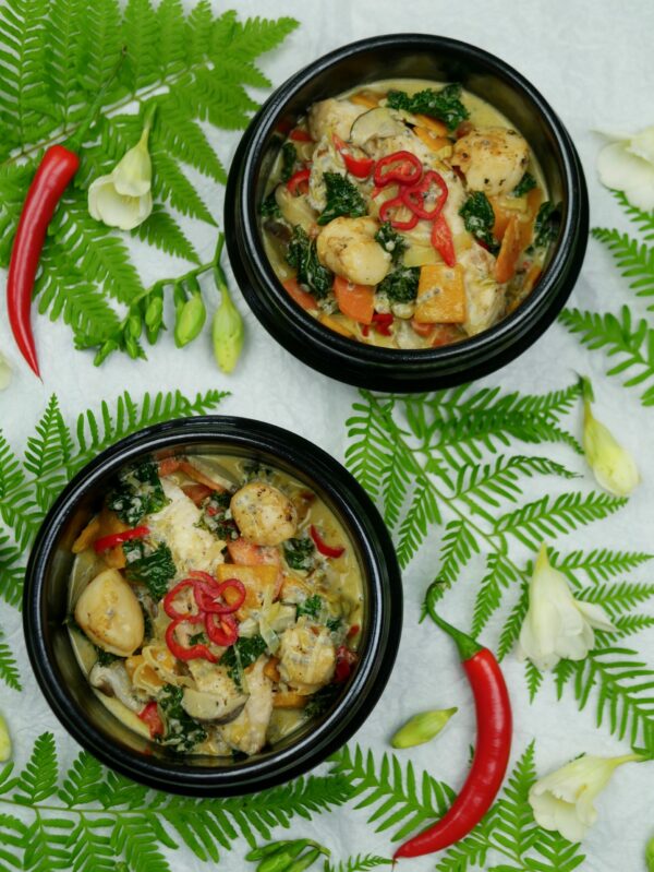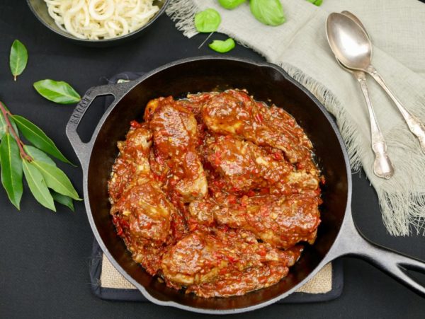 Preparation: 20 minutes Cooking: 1 hour 15 minutes Servings: 3–4 This tender chicken is gently roasted in the oven in a rich, fragrant sauce, then served upon a tangle of lightly cooked parsnip noodles. The slow cooking heightens the sweetness of the tomatoes and pepper and deepens the flavour. Paprika adds a slight smoky note to the thick aromatic sauce. Brain Food Note Chicken delivers protein, B vitamins, iron, and omega-3s for an even, happy mood and a clear mind. Tomatoes are rich in antioxidants and aid in reducing stress and brain fatigue.I’ve includedbone broth for a soothing and healing effect for the gut and the brain.