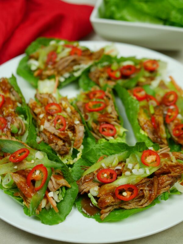 Alternatively, place the chopped cabbage and carrot into cos lettuce cups and lay the pork on top, then add cucumber strips, sliced spring onion, thinly sliced chilli, and coriander, if desired.