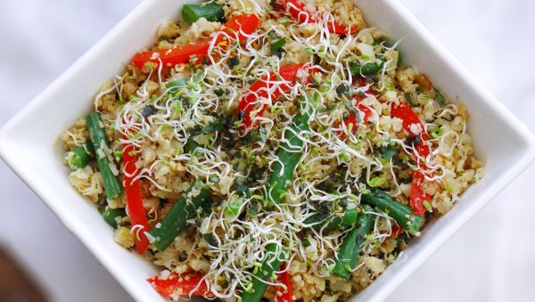 Fried rice is one of those dishes that you can easily adjust to suit your taste. You can add in an array of vegetables, herbs, and spices. You can have it vegetarian, or add chicken, prawns, pork, or other proteins if you feel like it. I think it’s delicious as a dinner and leftovers are great for kids lunches. I actually like cauliflower fried rice better than the actual rice version! What You Need ½ large cauliflower head or 1 whole small head 1 onion, finely chopped 2 garlic cloves, finely chopped A thumb size piece of ginger, finely chopped 200g green beans, sliced ½ large red capsicum/pepper, sliced 1 large handful of bean sprouts 2 spring onions, finely sliced 2 tablespoons of herbs of your choice (I used parsley and thyme) 4 eggs, beaten 2 tablespoons coconut oil 1-2 tablespoons coconut aminos Sea salt and freshly ground black pepper What To Do- Pop the cauliflower florets in a food processor and pulse until your cauliflower resembles rice. I used my Vitamix and did the cauliflower in four portions so it wouldn't jam the blades.