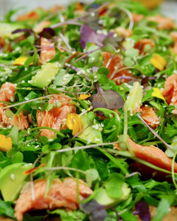 Preparation: 10 minutes Servings: 4 This salmon and avocado green salad makes a delicious lazy Sunday lunch or a light supper with some home-made bread. This is a perfect combination of roasted salmon and magical avocado, with peppery rocket and an earthy touch of edible flower petals. I feel a simple dressing of lemon juice and avocado oil cuts beautifully through the richness of the salmon, giving a fresh citrus zing to the salad. Toss a handful of sesame seeds over the top for a bit of texture. Brain Food Note Salmon and avocado are rich in omega-3 fatty acids, which are the brain-nourishing fats. Pairing these two wonderful foods with the powerful nutrient content of leafy greens will help clear your mind, sharpen your focus, and balance your mood. You Will Need 2 cups baby rocket leaves 1 cup baby spinach leaves 1 avocado, sliced 1 smoked or roasted salmon fillet 1 tablespoon sesame seeds 1 tablespoon edible flower petals juice of 1/2 lemon drizzle of avocado oil (optional) What To Do Wash and dry the salad greens, either patting dry between two tea towels or using a salad spinner. Toss the rocket and spinach leaves together in a large bowl. Add avocado pieces to the salad greens and break up cooked salmon into rough pieces to add to the salad. Squeeze lemon juice over the salad and toss gently. Arrange the salad on a platter, drizzle over avocado oil if using it, and scatter sesame seeds and flower petals over the top. Serve with home-made gluten-free bread or sourdough.Warm Earth Salad with Creamy Avocado Dressing