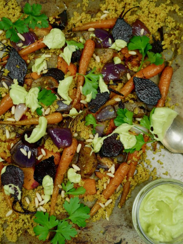 Preparation: 20 minutes Cooking: 25 minutes Servings: 4 as a side This is a lovely and satisfying warm earthy salad that is perfect on its own or accompanying a piece of fish or chicken. Roasted earth vegetables are tossed with warm, fluffy turmeric and lemon quinoa, dressed with a vibrant, creamy avocado dressing. Brain Food Note Pumpkin and sweet potato work well here to improve memory and concentration, while the protein, magnesium, and folate in quinoa stabilises mood and reduces anxiety. Golden turmeric helps calm and clear the mind, and the zing of lemon hinders anxiety. Vibrant red beets help with mental fatigue and alertness, plus I’ve added smooth avocado for good healthy fats to boost brainpower. You Will Need 6 baby beets, peeled and halved 10 baby carrots, peeled and whole 3 small red onions, peeled and quartered 1 cup pumpkin, peeled and cubed 1 cup sweet potato, peeled and cubed 4 garlic cloves, halved 2 tablespoons coconut oil or ghee 1 teaspoon sweet paprika 1 cup white uncooked quinoa 2 cups chicken or vegetable broth 1 teaspoon turmeric powder 1/2 teaspoon ground cumin zest and juice of 1 lemon 1 handful flat-leaf parsley, torn 2 tablespoons pine nuts, toasted Dressing 1/2 avocado 3 tablespoons coconut milk 1 garlic clove, roasted 1/2 cup flat-leaf parsley 1/4 teaspoon salt 1/2 cup olive oil What to Do Preheat the oven to 180 degrees C. Wash and prepare the vegetables. Place the beets, carrots, onions, pumpkin, sweet potato, salad garlic, and dressing garlic with coconut oil or ghee in a large roasting dish. Sprinkle the paprika over the top. Cook the vegetables for 20–25 minutes, or until they are just tender. Strain the quinoa through a fine mesh sieve, rinsing through with clean cool water for 2 minutes. Place the quinoa in a small saucepan and add 2 cups of broth. Bring to a boil, then turn down the heat and simmer for 20 minutes, uncovered. Stir in the turmeric powder, cumin, and lemon zest and squeeze over the lemon juice. Fluff the quinoa with a fork. Remove a clove of roasted garlic from the oven and place it, plus all of the other dressing ingredients except olive oil, in a blender. Process until well combined. With the blender on low, slowly pour in the oil and blend until the dressing thickens. Transfer to a small bowl. Any leftover dressing will keep stored in a sealed glass jar in the refrigerator for 3–5 days. Place the quinoa and roasted vegetables in a large bowl and toss gently to combine. Pile the warm vegetable salad onto a platter and toss the parsley and a sprinkle of pine nuts over the top. Spoon the dressing into a small bowl and place it on the side. Dress the salad before serving or leave for guests to dress the amount they desire.Bacon and Egg Cups