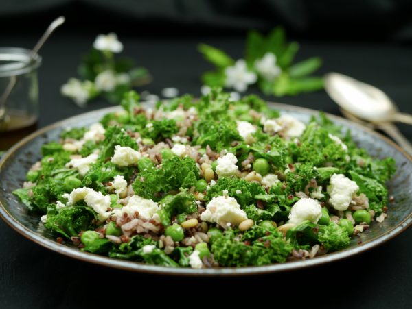 Preparation: 20 minutes Cooking: 25 minutes Servings: 4 as a side This is a lovely and satisfying warm earthy salad that is perfect on its own or accompanying a piece of fish or chicken. Roasted earth vegetables are tossed with warm, fluffy turmeric and lemon quinoa, dressed with a vibrant, creamy avocado dressing. Brain Food Note Pumpkin and sweet potato work well here to improve memory and concentration, while the protein, magnesium, and folate in quinoa stabilises mood and reduces anxiety. Golden turmeric helps calm and clear the mind, and the zing of lemon hinders anxiety. Vibrant red beets help with mental fatigue and alertness, plus I’ve added smooth avocado for good healthy fats to boost brainpower. You Will Need 6 baby beets, peeled and halved 10 baby carrots, peeled and whole 3 small red onions, peeled and quartered 1 cup pumpkin, peeled and cubed 1 cup sweet potato, peeled and cubed 4 garlic cloves, halved 2 tablespoons coconut oil or ghee 1 teaspoon sweet paprika 1 cup white uncooked quinoa 2 cups chicken or vegetable broth 1 teaspoon turmeric powder 1/2 teaspoon ground cumin zest and juice of 1 lemon 1 handful flat-leaf parsley, torn 2 tablespoons pine nuts, toasted Dressing 1/2 avocado 3 tablespoons coconut milk 1 garlic clove, roasted 1/2 cup flat-leaf parsley 1/4 teaspoon salt 1/2 cup olive oil What to Do Preheat the oven to 180 degrees C. Wash and prepare the vegetables. Place the beets, carrots, onions, pumpkin, sweet potato, salad garlic, and dressing garlic with coconut oil or ghee in a large roasting dish. Sprinkle the paprika over the top. Cook the vegetables for 20–25 minutes, or until they are just tender. Strain the quinoa through a fine mesh sieve, rinsing through with clean cool water for 2 minutes. Place the quinoa in a small saucepan and add 2 cups of broth. Bring to a boil, then turn down the heat and simmer for 20 minutes, uncovered. Stir in the turmeric powder, cumin, and lemon zest and squeeze over the lemon juice. Fluff the quinoa with a fork. Remove a clove of roasted garlic from the oven and place it, plus all of the other dressing ingredients except olive oil, in a blender. Process until well combined. With the blender on low, slowly pour in the oil and blend until the dressing thickens. Transfer to a small bowl. Any leftover dressing will keep stored in a sealed glass jar in the refrigerator for 3–5 days. Place the quinoa and roasted vegetables in a large bowl and toss gently to combine. Pile the warm vegetable salad onto a platter and toss the parsley and a sprinkle of pine nuts over the top. Spoon the dressing into a small bowl and place it on the side. Dress the salad before serving or leave for guests to dress the amount they desire.Kale and Quinoa Salad